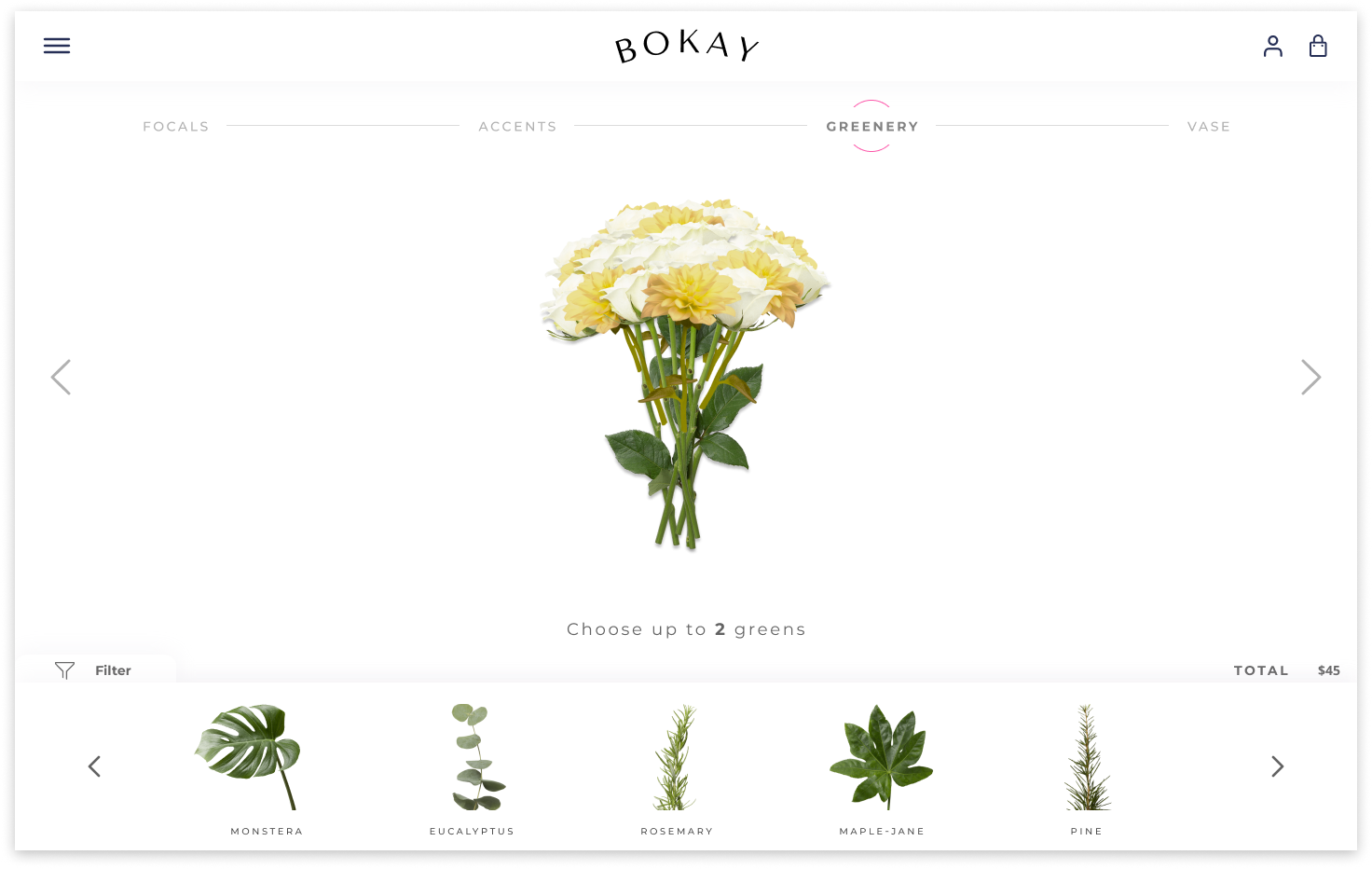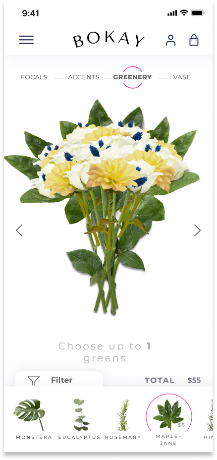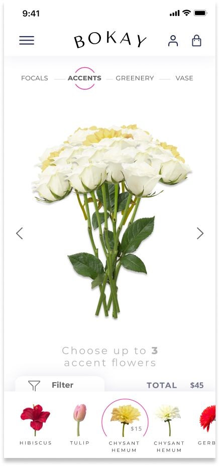 We knew we needed a simple sitemap that would guide the user to the customization tool. To establish a path for our users, we had to do some research to determine how florists create a bouquet. After studying different methodologies and speaking to the stakeholder, we settled on a four step process that encompassed a bouquet. The process begins with the user choosing their main or focal flowers. Next, they choose their accent flowers, the greenery or foliage, and finally, the vessel.